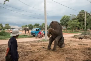 “When a baby is about two years old, they say, mahouts tie its mother to a tree and slowly drag the baby away. Once separated, the baby is confined. Using a bullhook on its ear, they teach the baby to move: left, right, turn, stop. To teach an elephant to sit, Sala-ngam says, “we tie up the front legs. One mahout will use a bullhook at the back. The other will pull a rope on the front legs.” He adds: “To train the elephant, you need to use the bullhook so the elephant will know.”