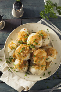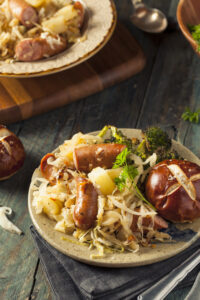 German Cuisine Homemade German Potato Dumplings with a Butter Sauce Homemade German Sausage and Sauerkraut with a Pretzel Roll Oktoberfest food. Holiday german dishes – sauerkraut, sausage, pretzel, mashed potato and beer. Top view on black table.