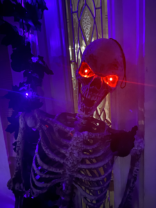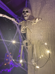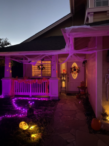 Every year, I decorate the house to get into the Halloween Spirit. To give it a spooky feel, I use outdoor cobwebs, along with bats and ghouls. I also change all the lightbulbs to either purple and orange colored bulbs.